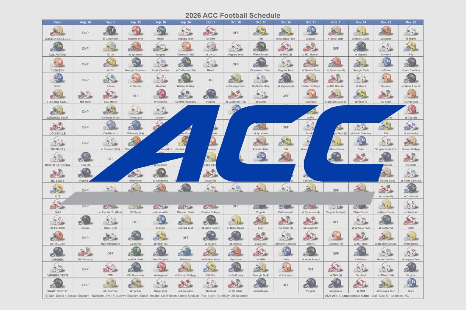 The 2026 ACC Football Helmet Schedule is now available. The PDF schedule features the team helmets, date, and opponent for each ACC team.