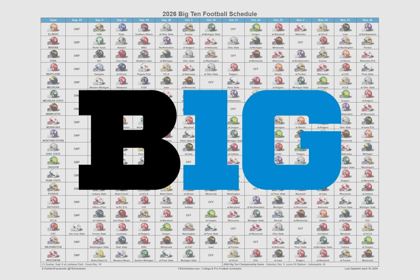 The 2026 Big Ten Football Helmet Schedule is now available. The PDF schedule features the team helmets, date, and opponent for each Big Ten team.